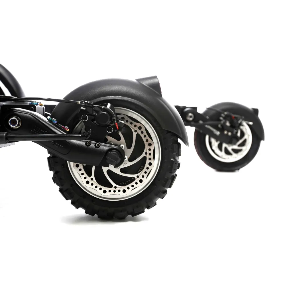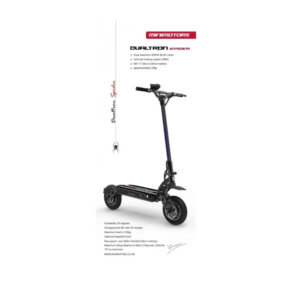 Dualtron Spider Limited полноприводный транспорт, мощность мотор-колес составляет 1600 Вт. Для контроля над таким агрегатом предусмотрены механические и электронные тормоза, транспорт развивает скорость свыше 65 км/ч. Аккумуляторная батарея LG, емкостью 24 А*ч, его заряда достаточно, чтобы преодолеть расстояние до 100 км. Есть возможность отключать один двигатель, переключение скоростных режимов позволяет подбирать удобный стиль езды. Колеса размером 10 дюймов, хорошая проходимость и маневренность делает электросамокат отличным транспортным средством на каждый день. Добираться на нем до нужного места быстро и комфортно.