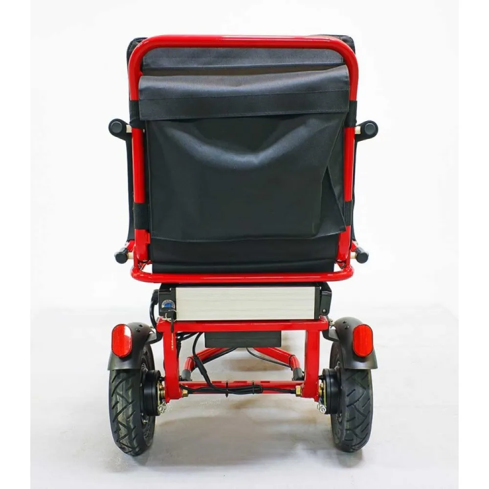 Широкая прорезиненная платформа обеспечивает полноценное размещение стоп, не вызывает усталости ездока. Светодиодная передняя фара допускает движение в вечернее время суток и непогоду. Электротрицикл – современная складная техника, которую сложить можно движением одной руки. В сложенном положении техника напоминает чемодан с ручкой.